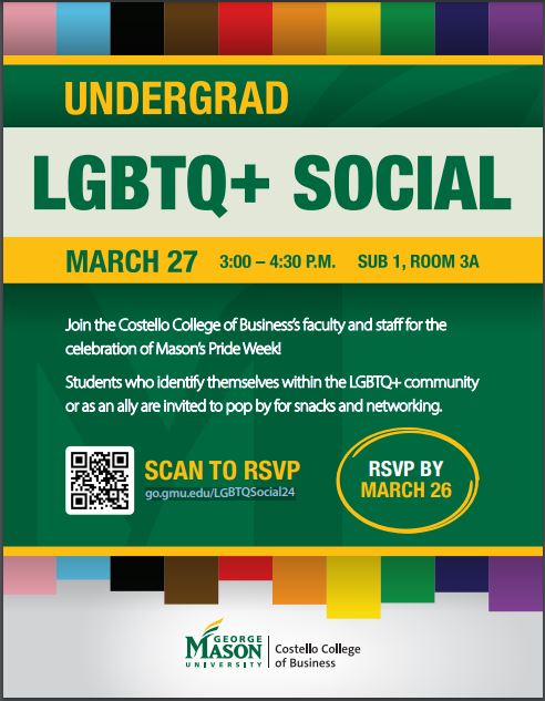 The Costello College of Business Academic Advisors invite all College of Business Faculty, Staff, and Students to a social to celebrate Mason's Pride Week. Details on the social are below: