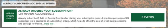Add-on tickets to these events are exclusively available to subscribers until individual performance tickets go on sale August 1 and must be ordered AFTER a subscription order is placed, or your order will be refunded.