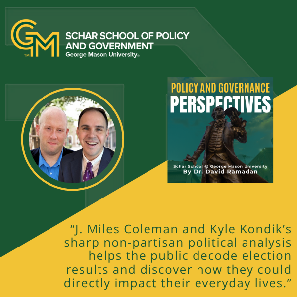 In this episode, we're digging into the 2025 elections, mostly in Virginia, and we may talk about New Jersey, two early tests of where voters stand ahead of the 2026 cycle. My guests are Kyle Kondik and J. Miles Coleman from Sabato’s Crystal Ball, one of the most respected election forecasting teams in the country. Their non-partisan political forecasting work is based at UVA's Center for Politics, where I happen to serve as a scholar as well. Therefore, I am happy to see my two friends join us here at George Mason.