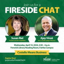 Mark your calendars for Wednesday, April 10 from 2:30–4 p.m. as Dean Ajay Vinzé welcomes Susan Riel, President and CEO of EagleBank, to the Fairfax Campus for a Fireside Chat.