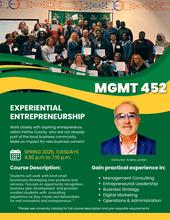 Work closely with aspiring entrepreneurs participating in the Center for Innovation and Entrepreneurship’s Workforce Innovation through Entrepreneurship (WISE) Program. Make an impact for new business owners! MGMT 452 meets Tuesdays (in-person) from 4:30 p.m. to 7:10 p.m. on the Fairfax campus.
